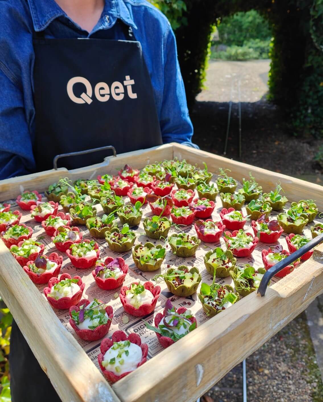 Voor onze catering werken wij met Qeet. Qeet staat voor lokale, duurzame en smaakvolle catering. Qeet werkt nauw samen met lokale boeren en producenten om de meest verse en verantwoorde ingrediënten te selecteren. Dit resulteert in heerlijke hapjes en dranken die niet alleen goed smaken, maar ook goed doen. Deze aanpak minimaliseert de ecologische voetafdruk en ondersteunt daarmee tevens de lokale gemeenschap. Wel zo sociaal! Of het nu gaat om een intiem diner of een groot evenement, Qeet biedt een culinaire beleving die duurzaamheid en smaak naadloos combineert.